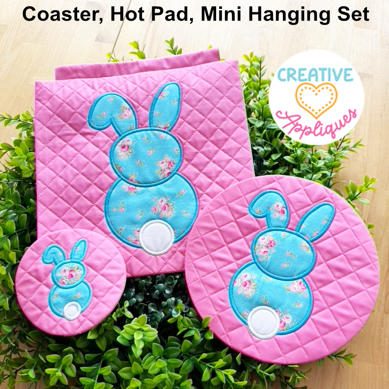 These adorable in-the-hoop rabbit coasters, hot pads, and mini quilt hanging designs are stitched completely in the hoop on your embroidery machine — fast, fun, and perfect for Easter decorating and gift giving!