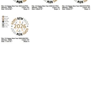 - Seven (7) sizes to fit hoop sizes 4×4, 5×7, 6×10, 7×11, 8×8, 8×12, and 9×14. See photo for sizes and stitch count.