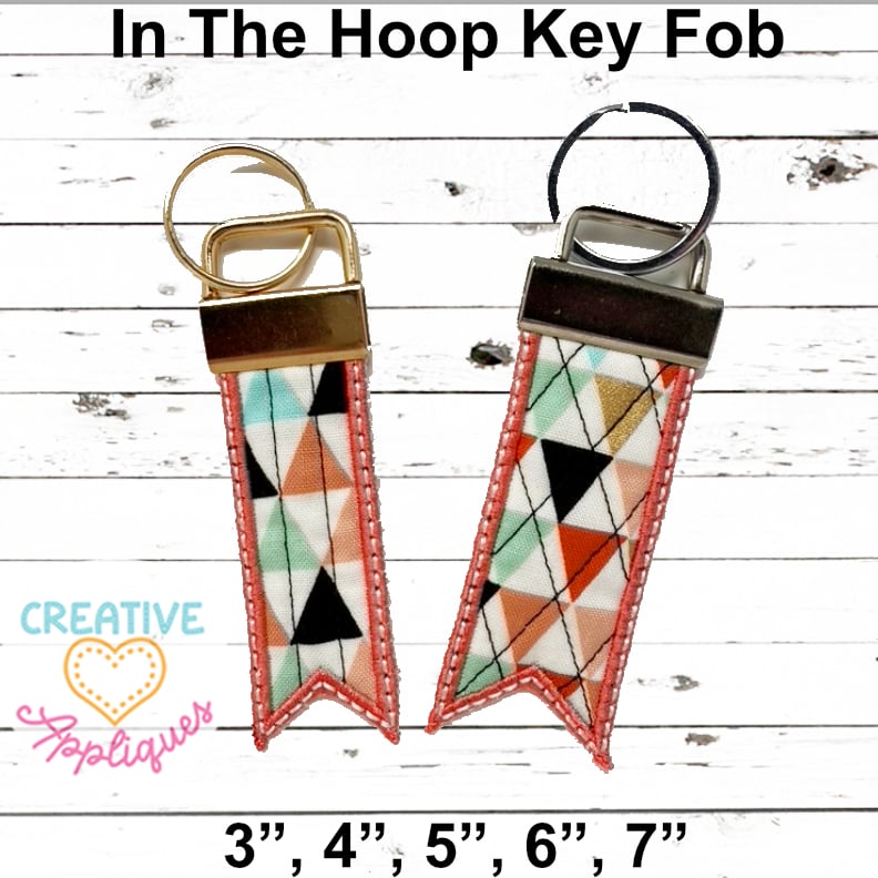 This in the hoop flag key fob set finished in a satin stitching is a super fast and easy stitch out that is completed in less than 10 minutes! Add several to the hoop at once, and stitch up these key fobs quickly!