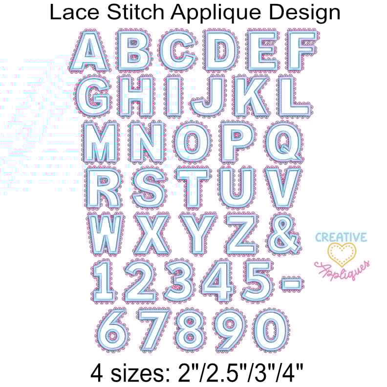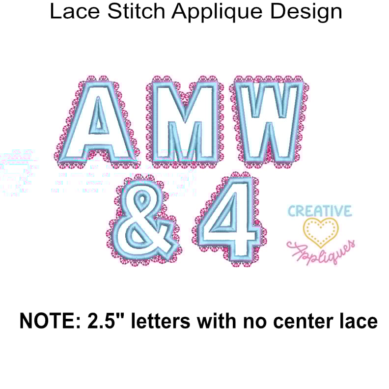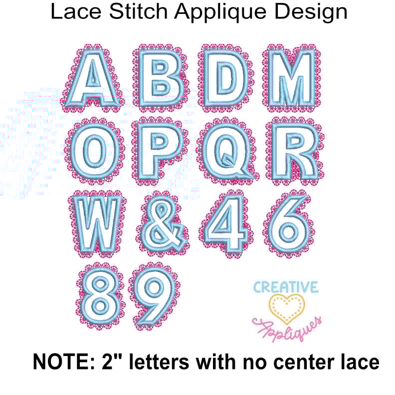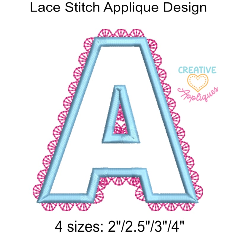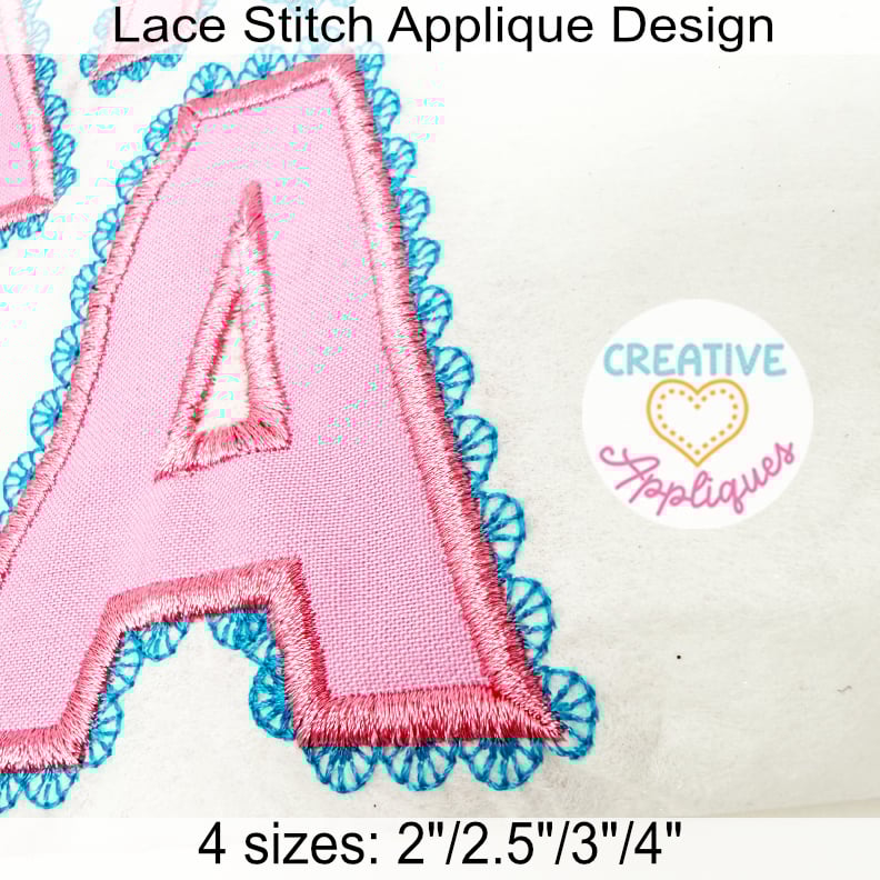 This is a single letter applique using 1 fabric piece outlined in a lace stitch and satin stitching. Note the variations in the 2 inch and 2.5 inch designs. See photos for sizes and stitch counts.