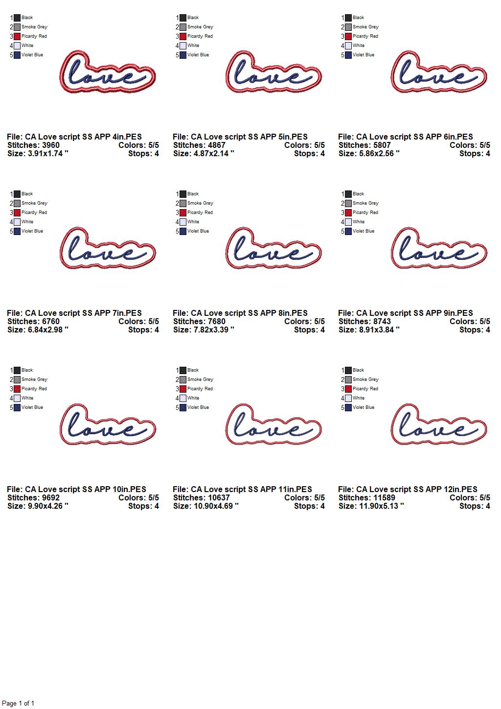 - Nine (9) sizes to fit hoop sizes 4×4, 5×7, 6×10, 8×12. See photo for sizes and stitch count.
